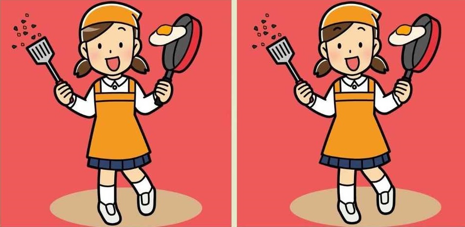 Na obeh risbah je deklica, ki pripravlja umešana jajca. In zdi se, da je v težavah, saj je ocvrto jajce tik pred tem, da s ponve pade na tla.